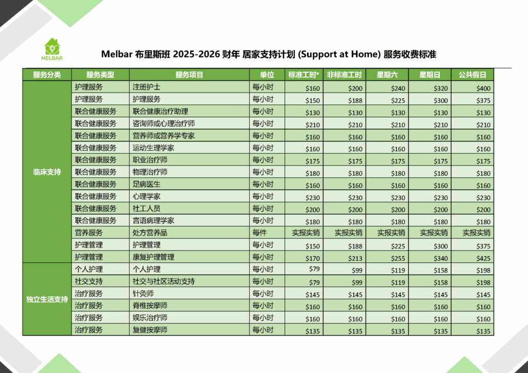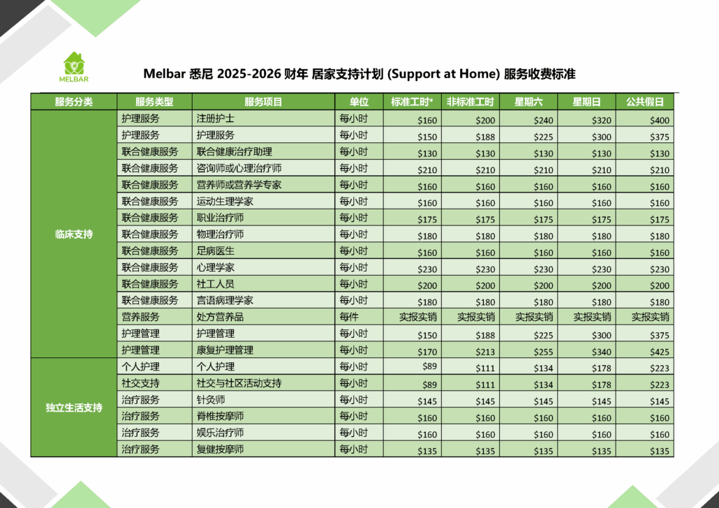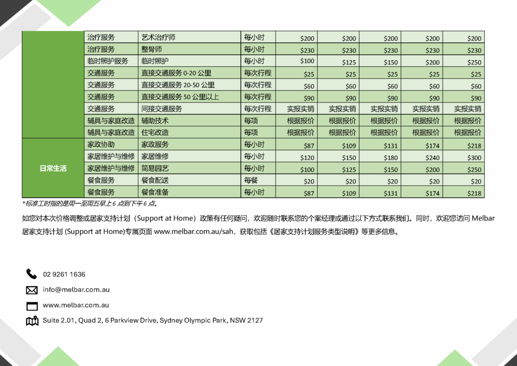 Melbar服务收费标准 - 悉尼