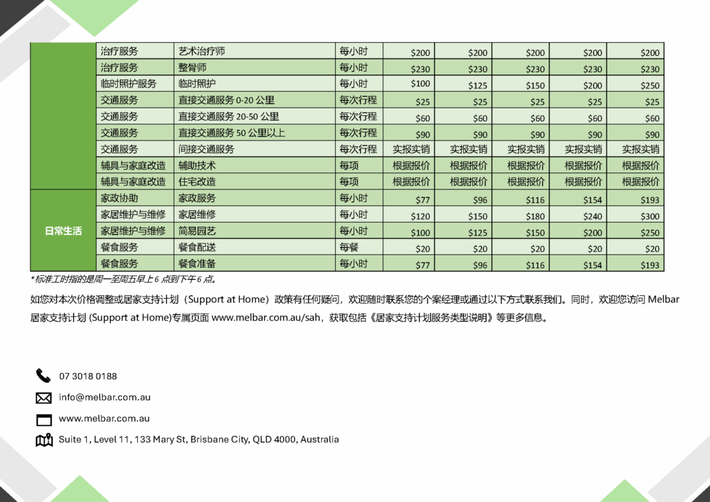 Melbar服务收费标准 - 布里斯班